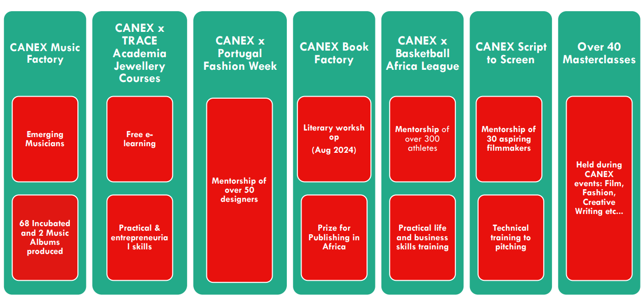 Production of SoundBank in mobile studio68 emerging artists incubated to produce songs with globally renowned music executives (Commissioner Gordon and Oskido)25 songs recorded Music Factory Promising artists FAMAS, Mama Sante, Reine Ablaa performed live during CANEX Summit2 commercial albums released on major streaming platforms e.g. iTunes, Spotify, Deezer