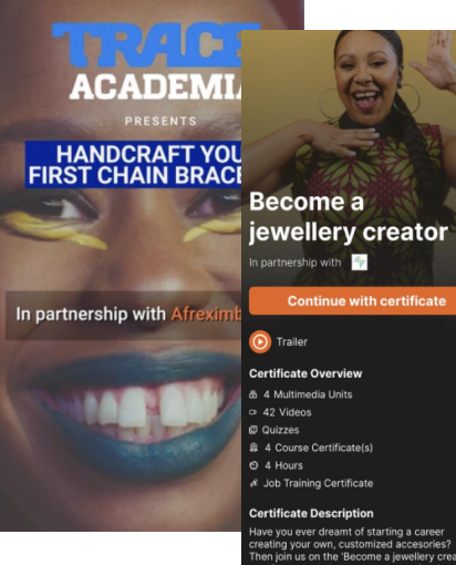 Design School Azza Fahmy Jewellery Making CourseLaunched in November 2022A 10 Module in depth course in partnership with TRACE AcademiaOver 5,000 currently registered users (majority from South Africa, Cote d’Ivoire, Nigeria and DRC)The course covers the various elements of Jewellery making from conceptualization, design, production, brand building and marketing