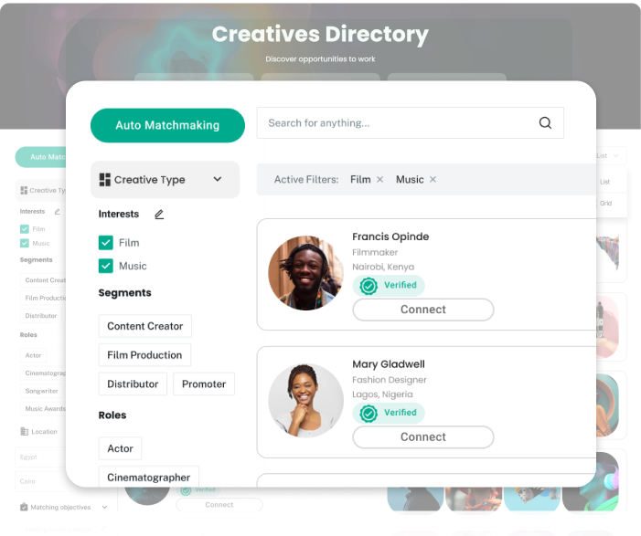 Utilise our AI intelligent matching feature to find the perfect collaboration opportunities across the continent. Connect with other creatives and spark new projects and ideas.