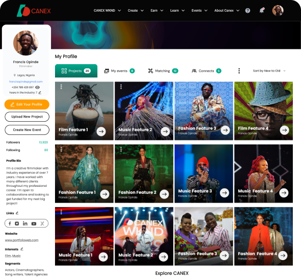The Creative Hub on CANEX.AFRICA is where imagination takes form. Designed specifically for creatives of all kinds, the Creative Hub offers the opportunity to showcase your work, connect with peers, industry professionals, and the resources needed to bring your creative vision to life—whether it’s your next film, music production, or fashion line.