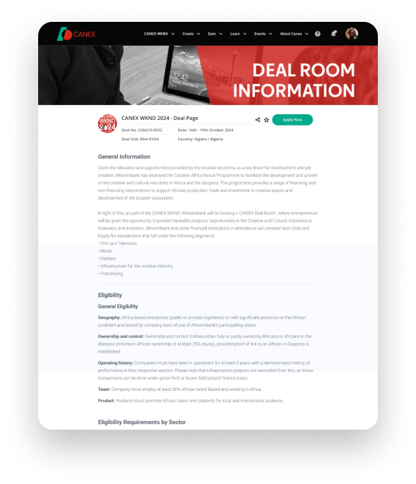 This is where creativity meets financial success. You can transform your passion into sustainable revenue through our exclusive deal room, networking events, and partnerships with investors. Turn your creativity into a thriving business by leveraging the powerful tools and networks CANEX.AFRICA has to offer.