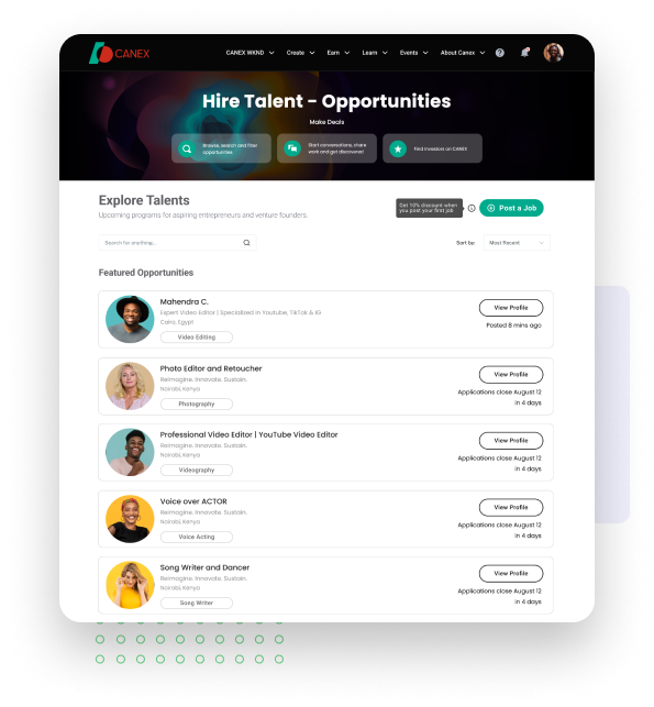 CANEX.AFRICA bridges the gap between creativity and commerce. Our Earn Hub provides a digital marketplace where you can, secure funding and find new business opportunities. Whether you’re looking to distribute your latest film, sell your fashion designs, or attract investment for your next project, CANEX.AFRICA connects you with a global market eager to discover and support African talent.